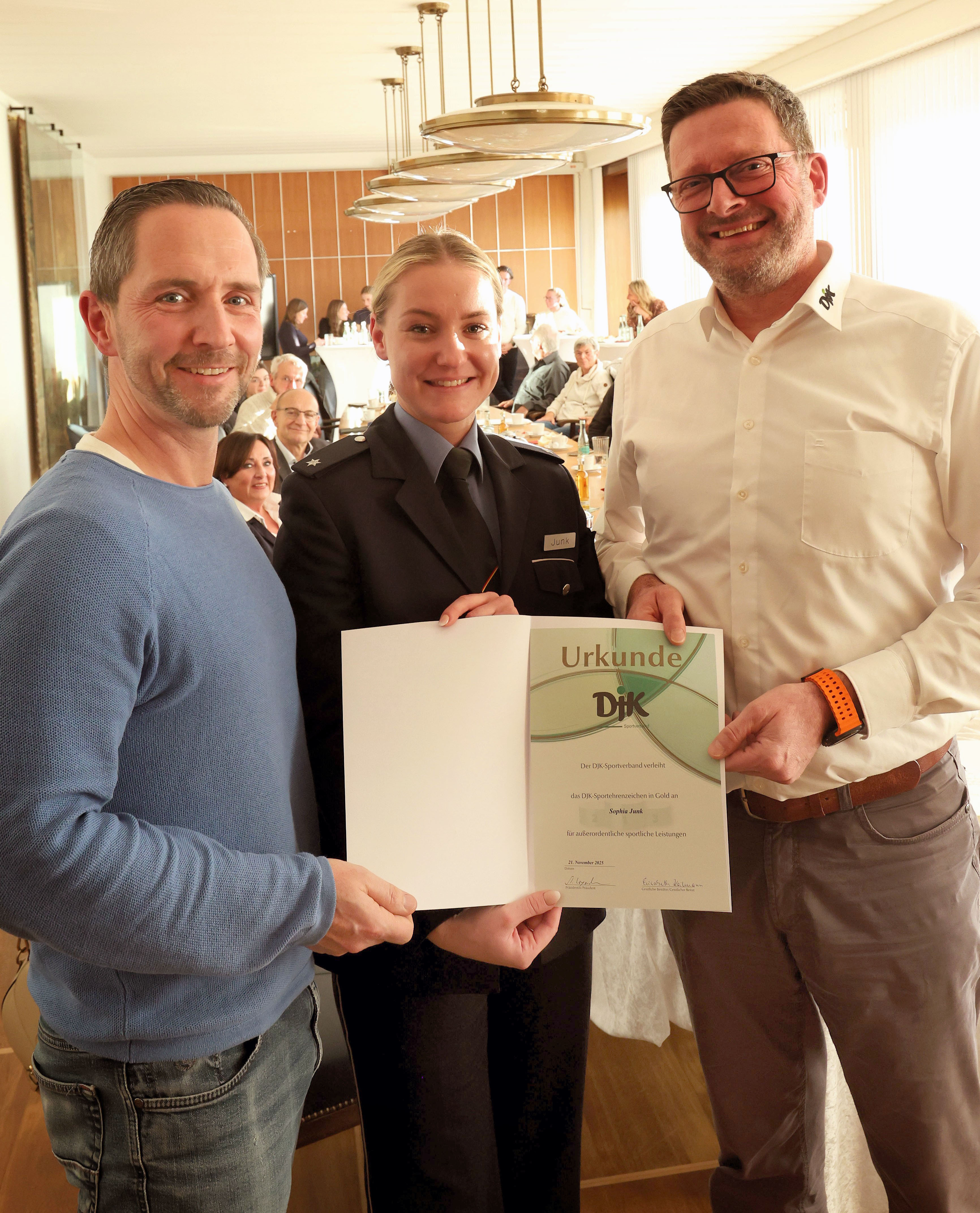 DJK-Diözesanvorsitzender Bernd Butter (Ochtendung) ehrte nunmehr Junk mit dem DJK-Sportehrenzeichen in Gold – eine besondere Anerkennung für ihre sportlichen Leistungen und ihre Vorbildrolle im DJK-Sportverband.